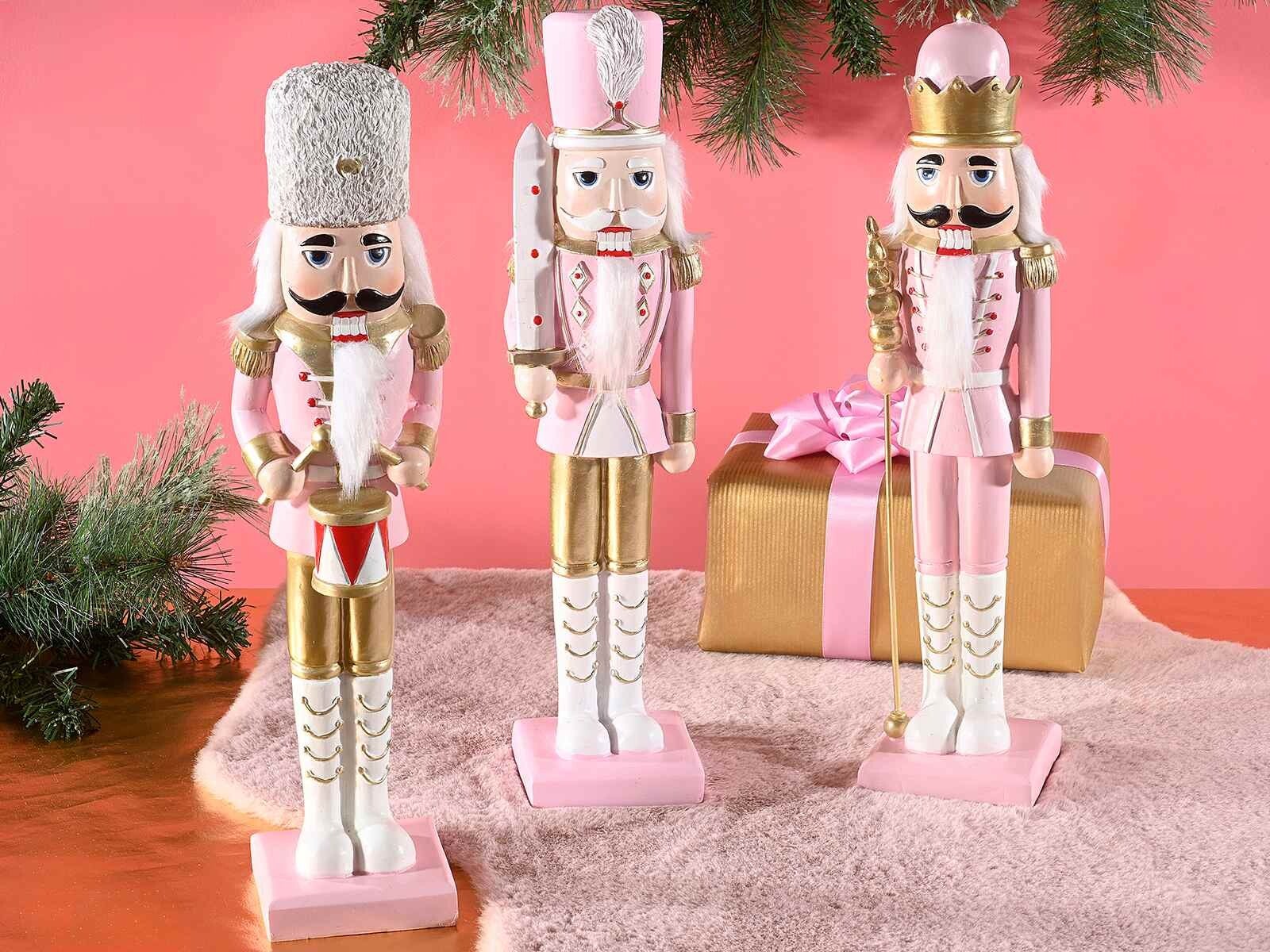 Personaggio Schiaccianoci in resina rosa e dorata.
