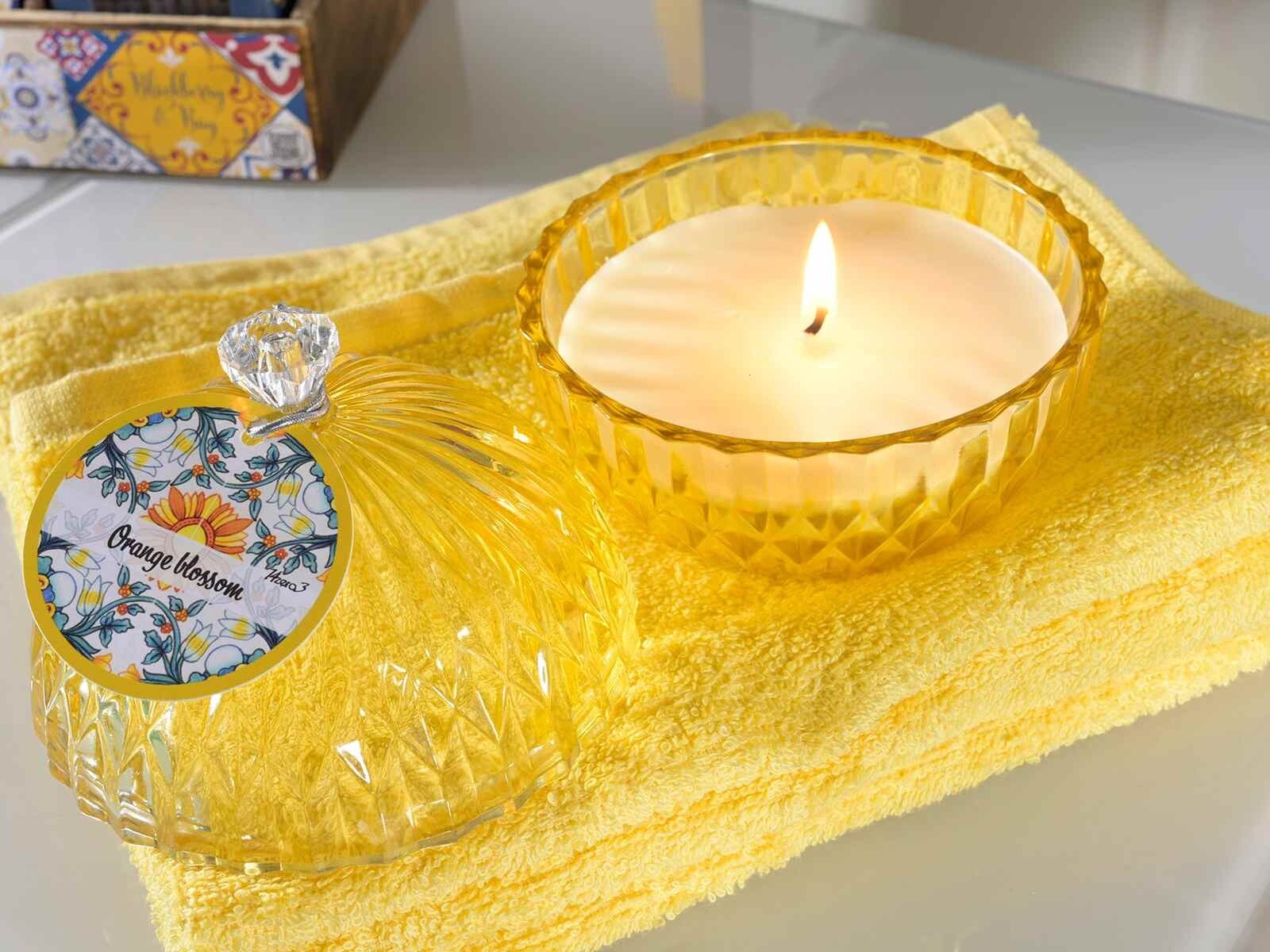 Candela profumata in sfera di vetro colorato, con coperchio.