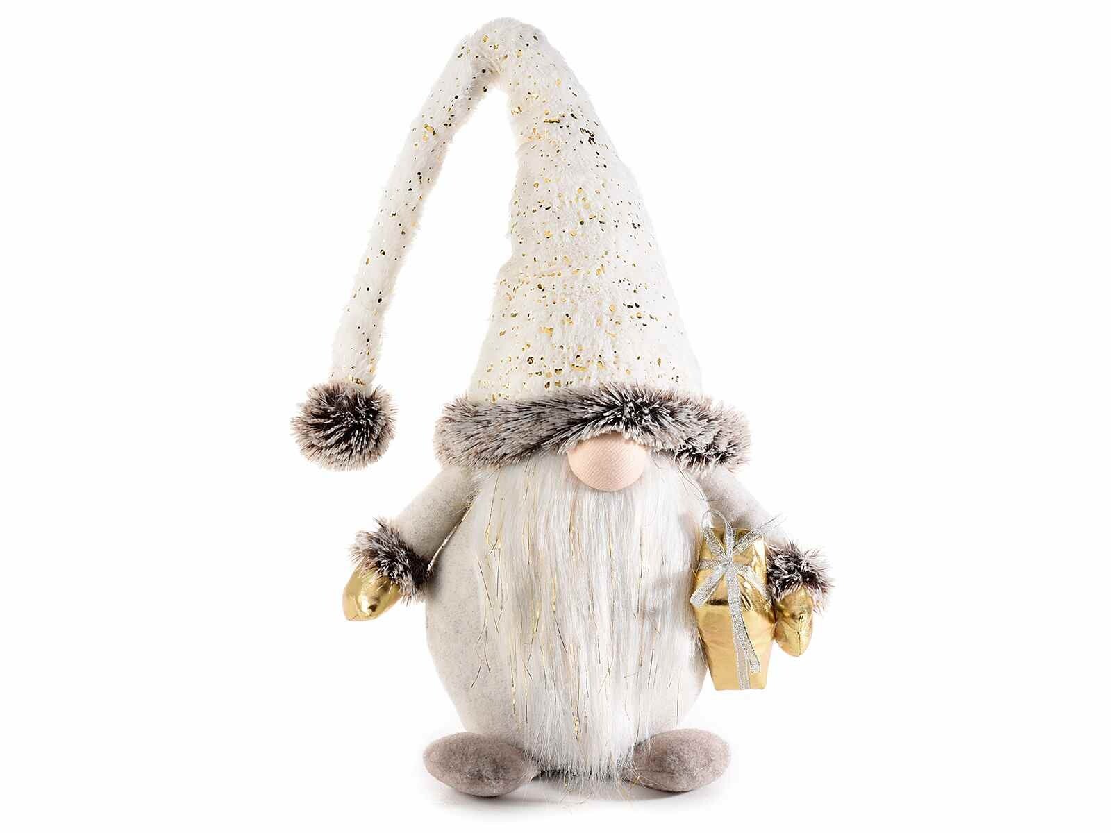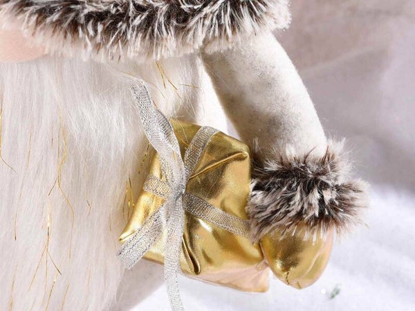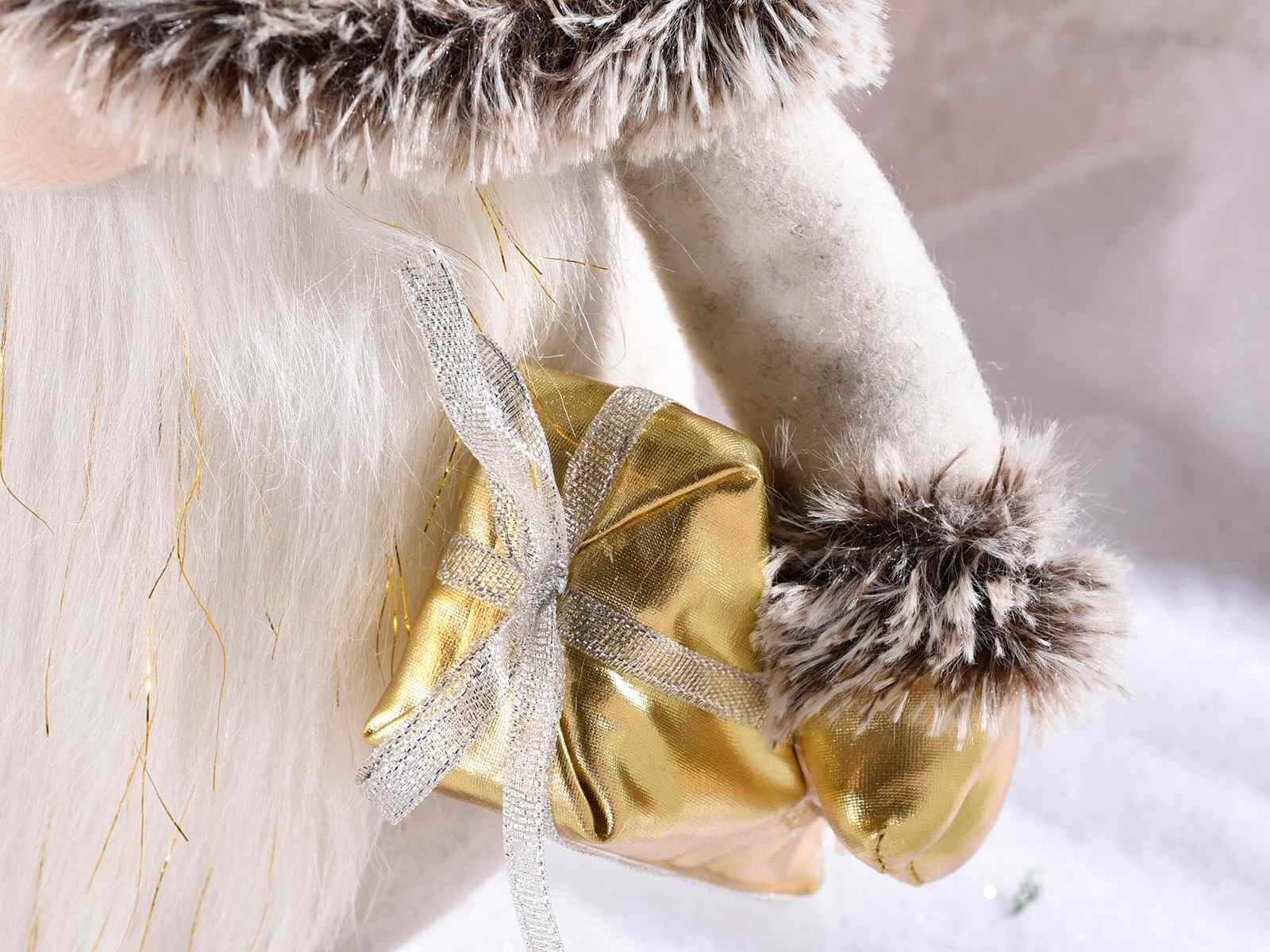 Babbo Natale con pacchetto regalo, guanti e fili dorati.