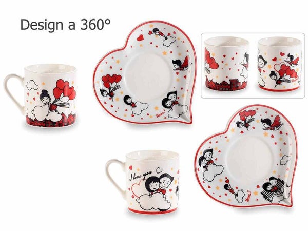 Coppia di tazzine da caffè con piattino a cuore, in porcellana.