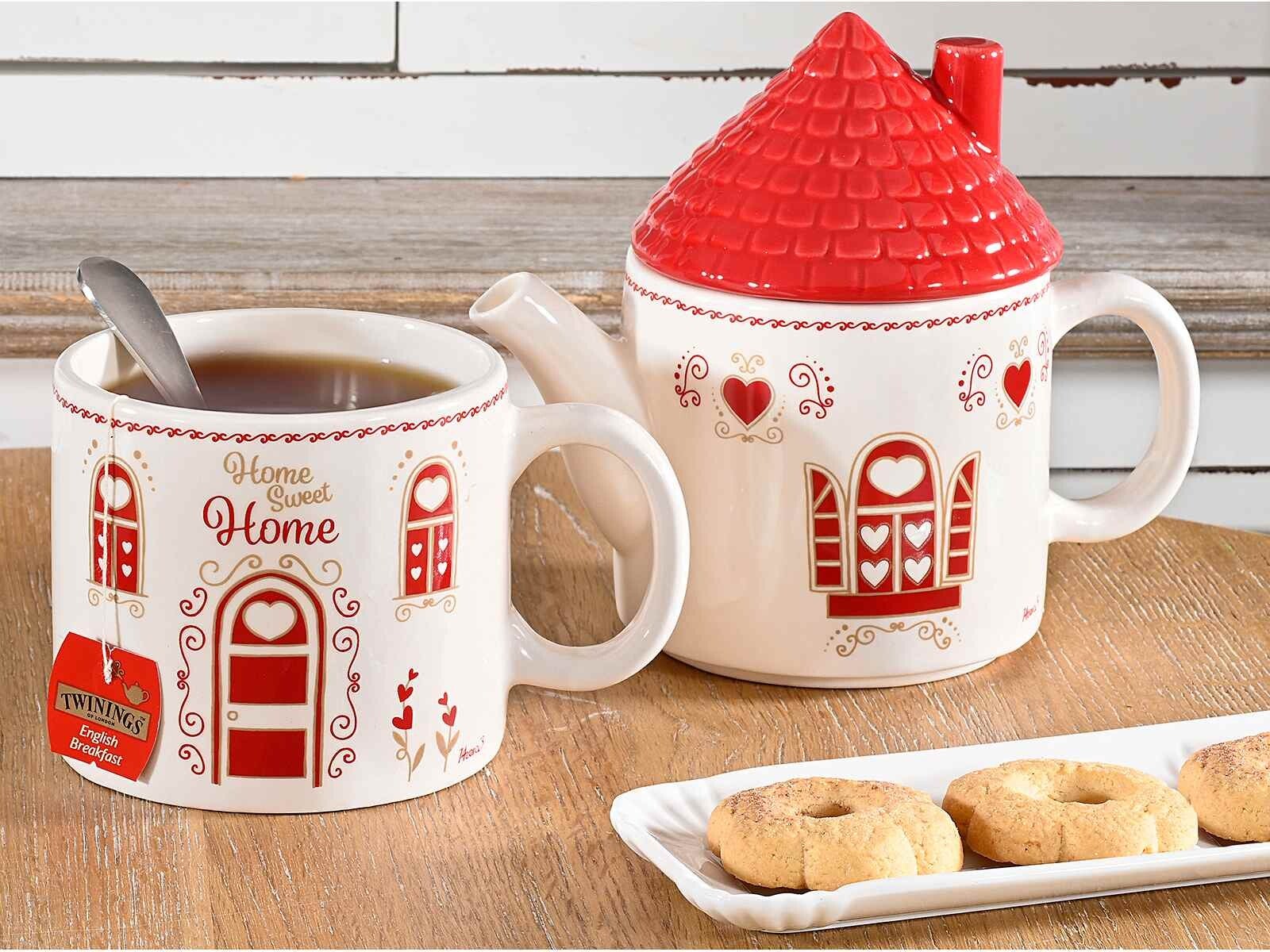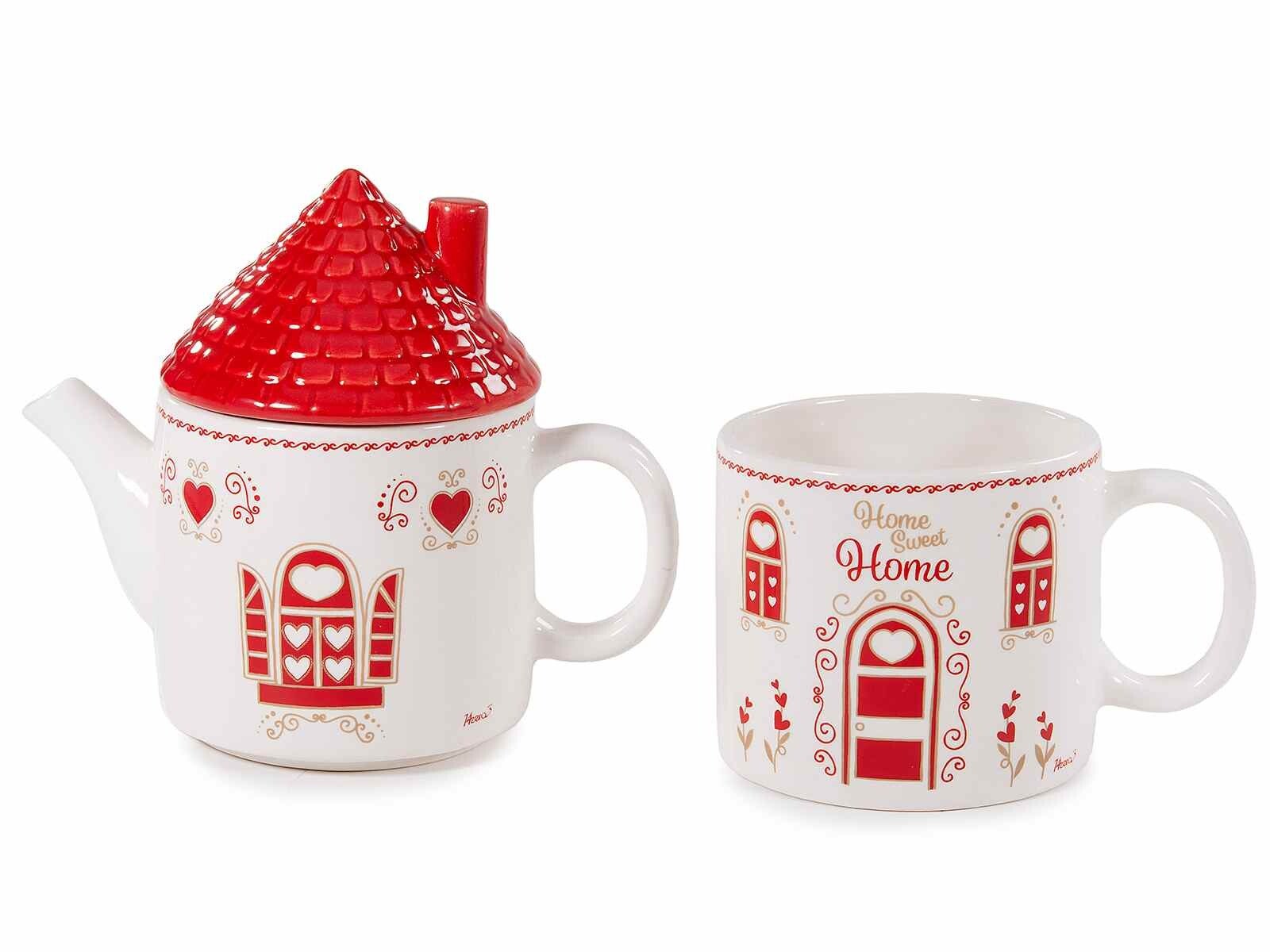 Set tazza e teiera, in ceramica, con coperchio a tettuccio.