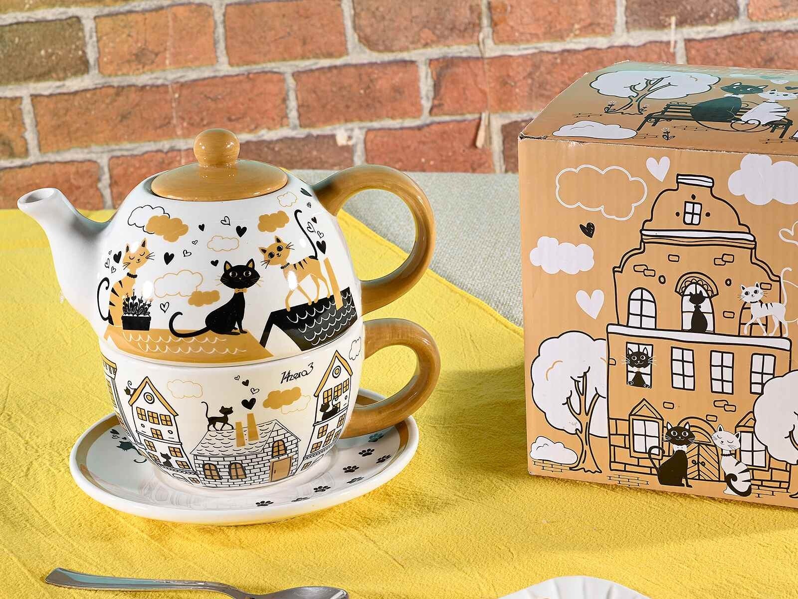 Teiera e tazza in set in ceramica, con piattino.