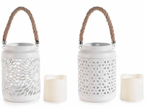 Lanterna in metallo con candela elettronica e manico in corda.