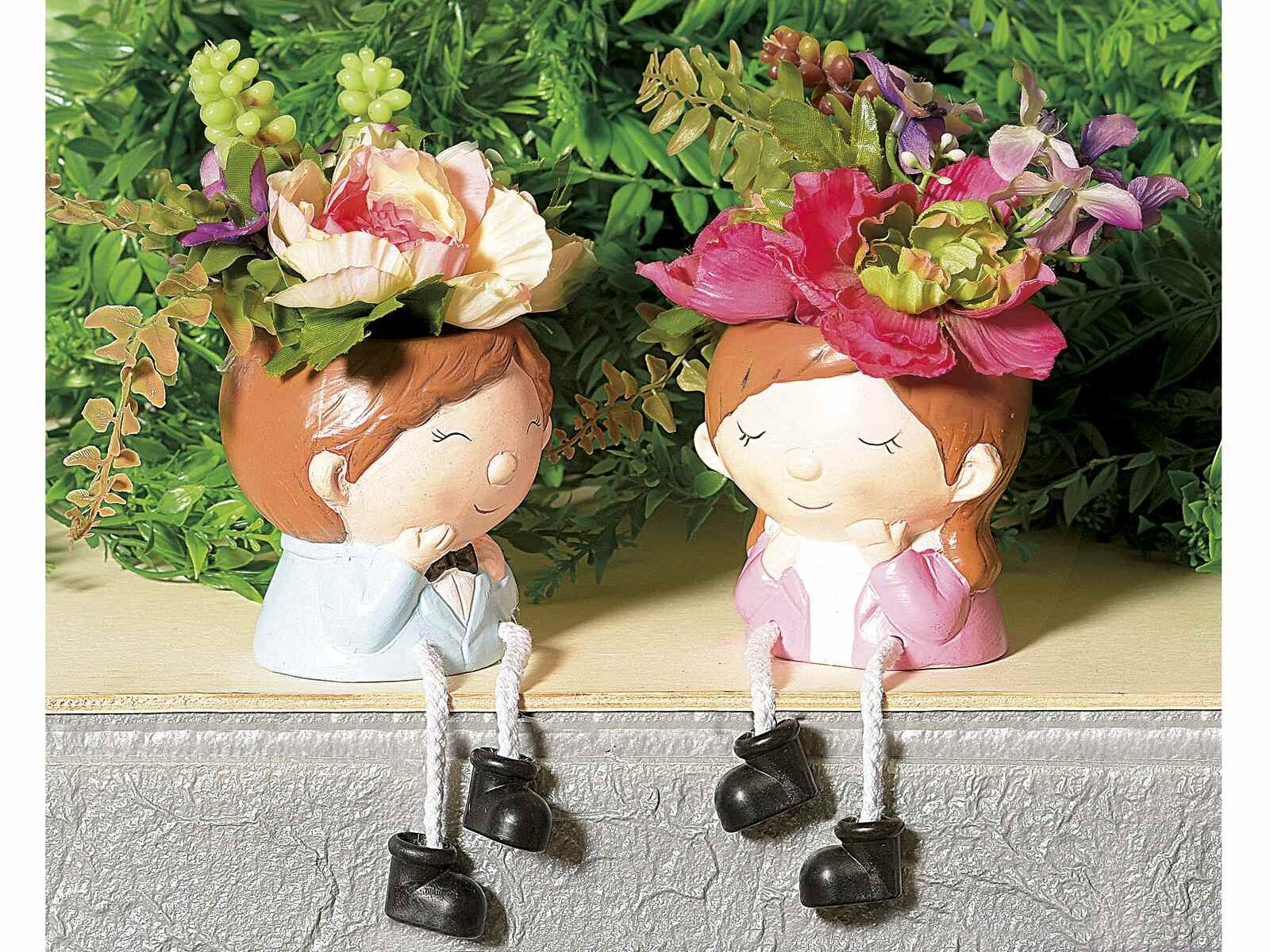 Coppia di vasetti in ceramica colorata, con gambe in corda.
